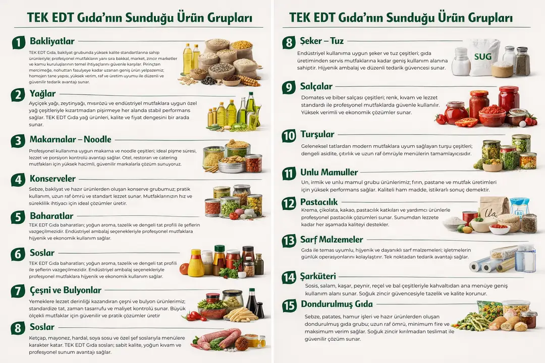 Tek EDT olarak; hızlı teslimat, kaliteli ürün çeşitliliği ve kesintisiz hizmet anlayışımız ile toptan gıda sektöründe sürdürülebilir değer yaratmaya devam ediyoruz.